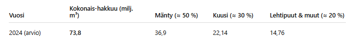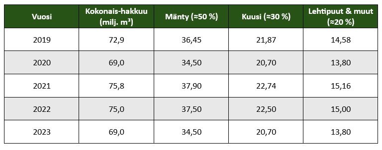 Lisää taulukon yläpuolelle otsikko Suomen runkopuun hakkuukertymä ja arvioitu lajijako 2019–2023 (Otsikko 1). Musta lihavoitu ja koko 24 pt.